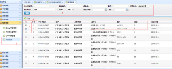 - 3)根据品种名、批号、数量勾选需要一起开票的数据(即开到一张发票的数据)